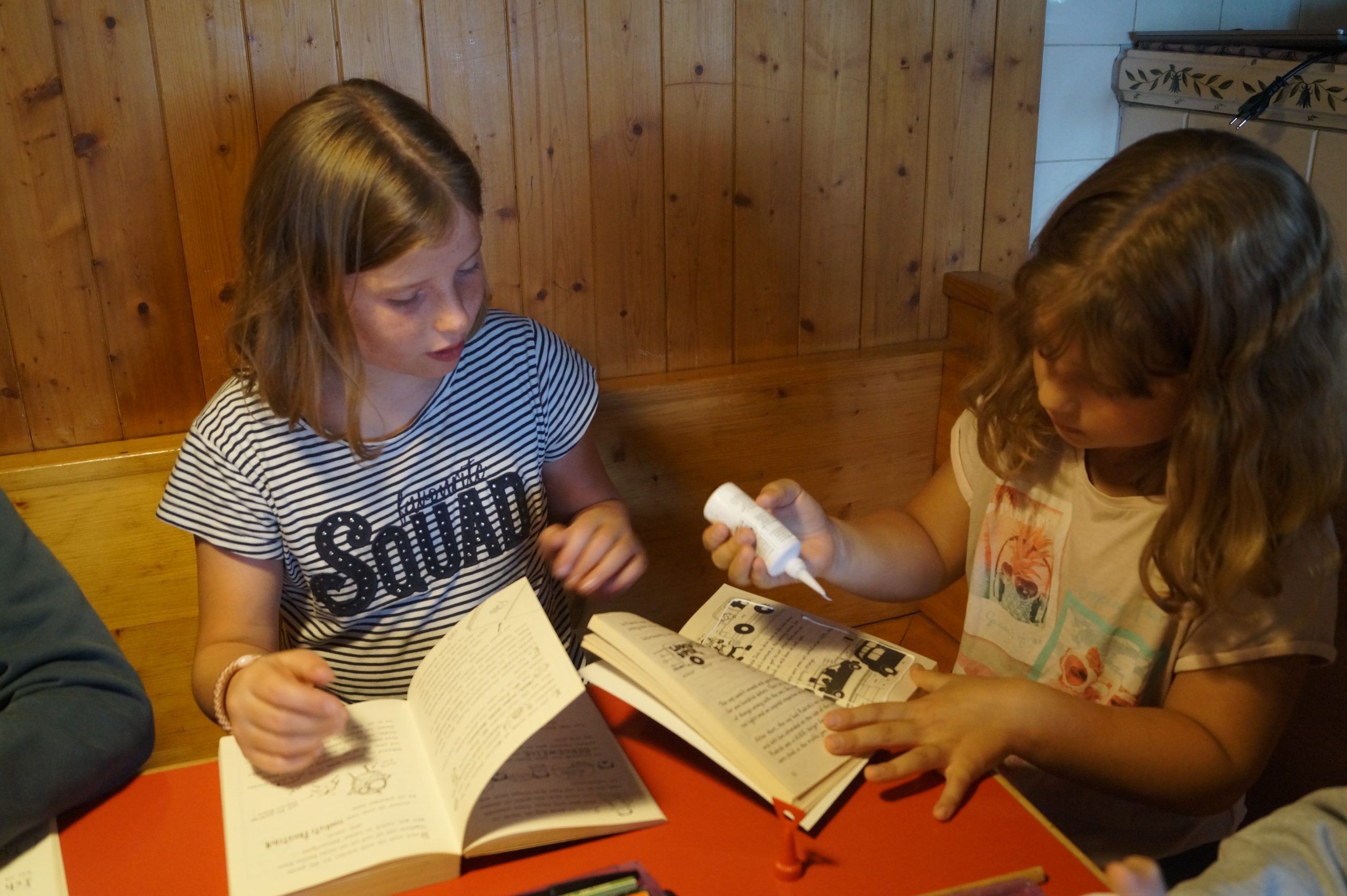 Am Vormittag konnten verschiedene wichtige Gegenstände rund um das Thema Tim und Struppi gebastelt werden. Damit Tim im Geheimen kommunizieren kann, wurden eifrig Texte verschlüsselt und wieder entschlüsselt. Um diese geheimen Botschaften sicher zu transportieren, wurden Bücher mit versteckten Geheimfächern präpariert. Außerdem konnten Ketteli gebastelt werden als Zeichen der Gemeinschaft unter allen helfenden Detektiven. Zur Erinnerung an vergangene Reisen von Tim und Struppi und als weiteres Transportmittel für Botschaften wurden auch Raketen und Papierflieger hergestellt.